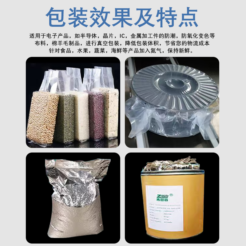 - 真空包装功能:能够自动抽出包装袋内的空气,使袋内达到预定的真空度,从而有效防止产品氧化、霉变、虫蛀、腐烂、受潮等,延长产品的保质保鲜期限。可用于食品、医药、电子元件等多种产品的包装,如肉类、粮食、中草药、电子芯片等367.