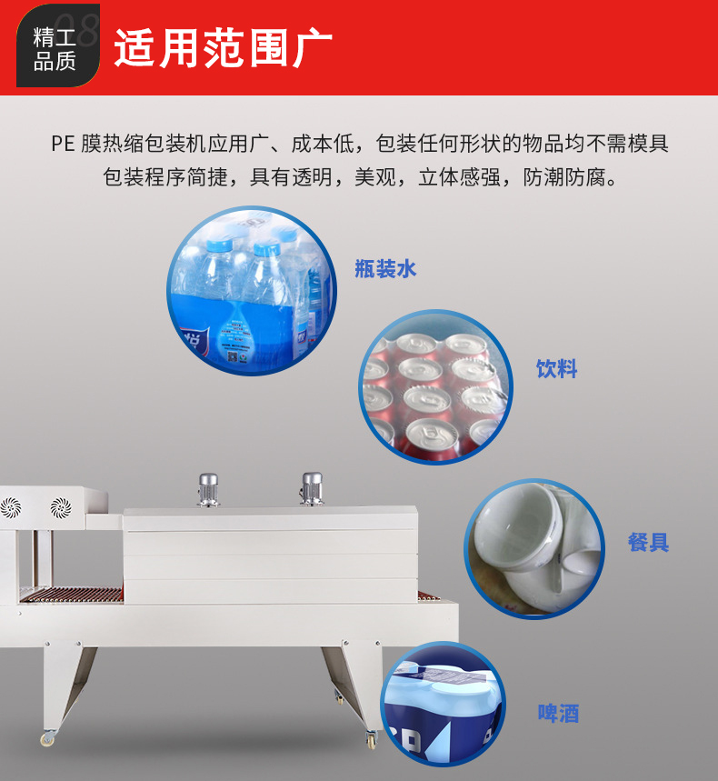 - 适用于中型规模的包装生产线。其优势在于加热均匀、稳定,使用寿命长。在一些中型的食品、日用品生产企业中,不锈钢加热系统的 PE 热收缩机能够提供高质量的包装效果,满足一定批量产品的包装需求。