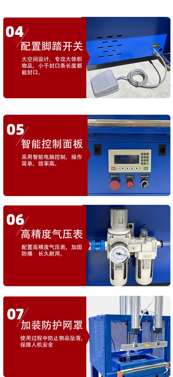 - 压力大小:合适的压力能使包装材料在加热时充分接触并融合,形成牢固的封口。压力不足,封口处无法完全密封,会出现漏缝。压力过大,可能会使包装材料过度挤压、变形,甚至损坏,尤其是对于一些质地较软或较薄的材料,容易导致封口处破裂或材料内部结构受损。