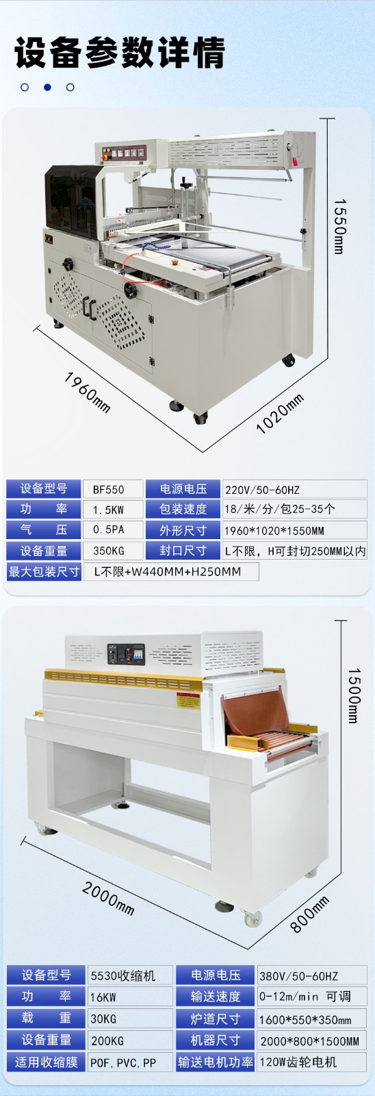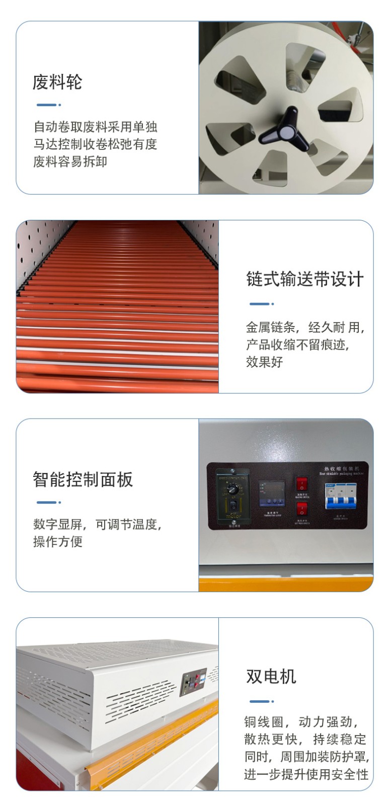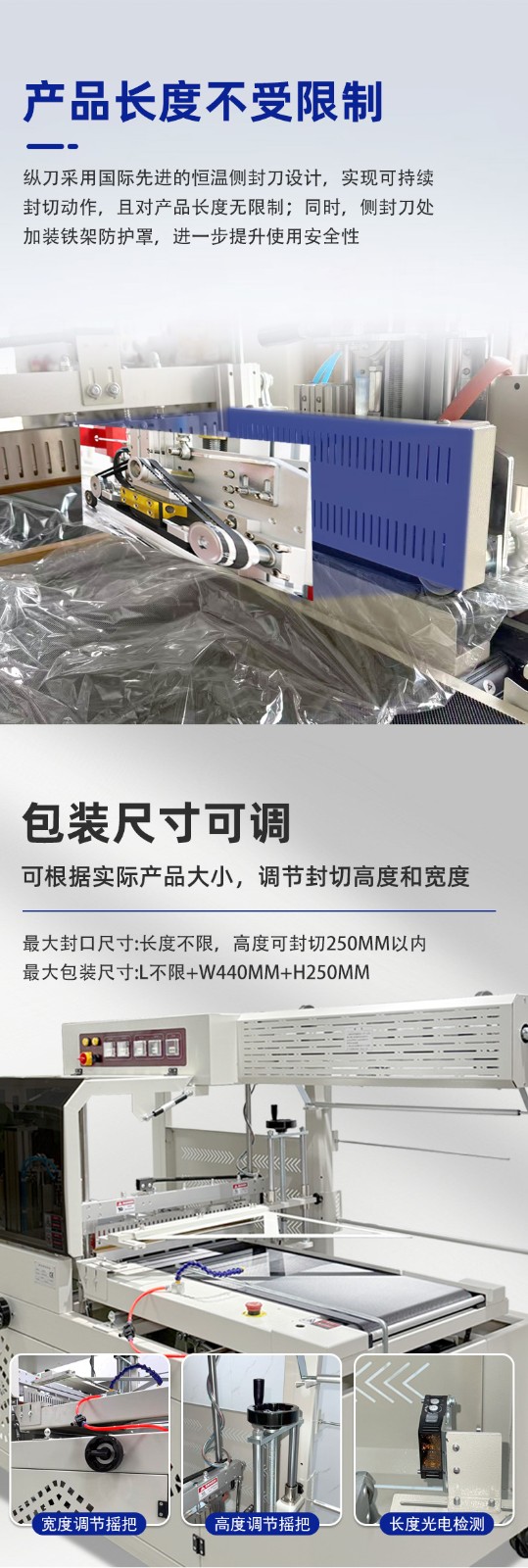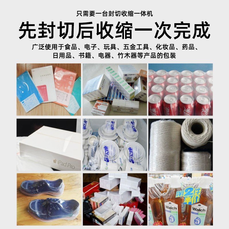 - 纵向高度:通过升降封切装置或调整热收缩隧道高度,适配 20-300mm 高的产品(如从包装 5cm 高的便利贴到 25cm 高的桶装零食);部分定制机型还可扩展尺寸范围,满足大型产品(如小型家电、工具箱)的包装需求,进一步拓宽适用边界。