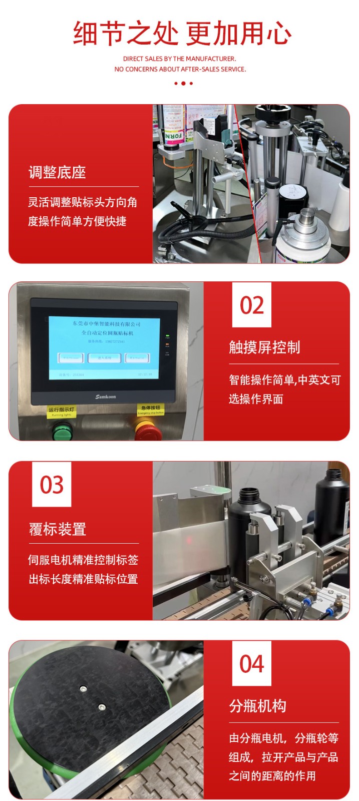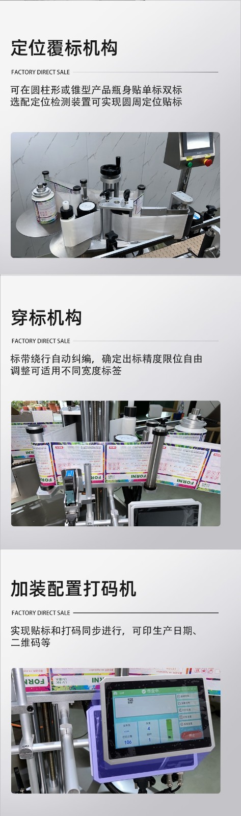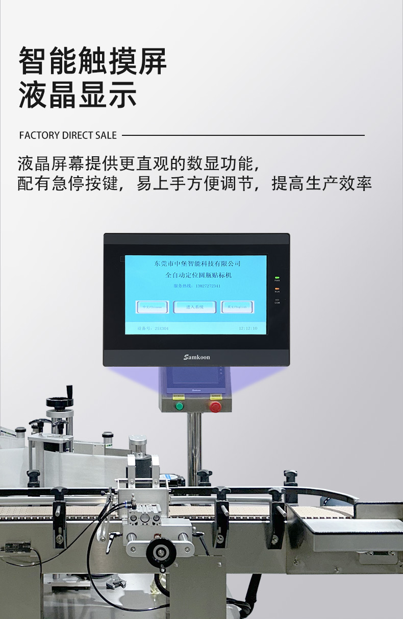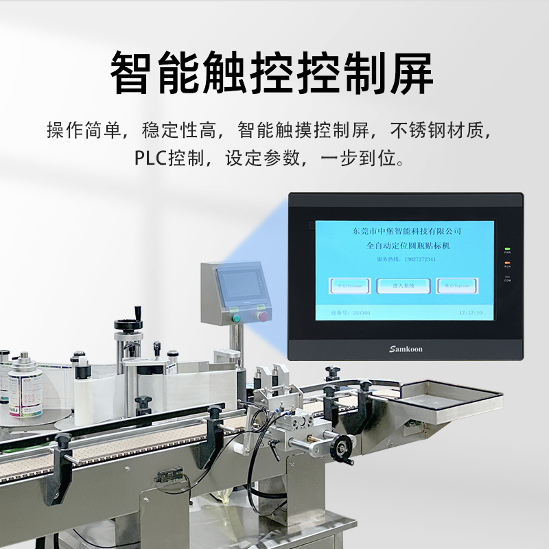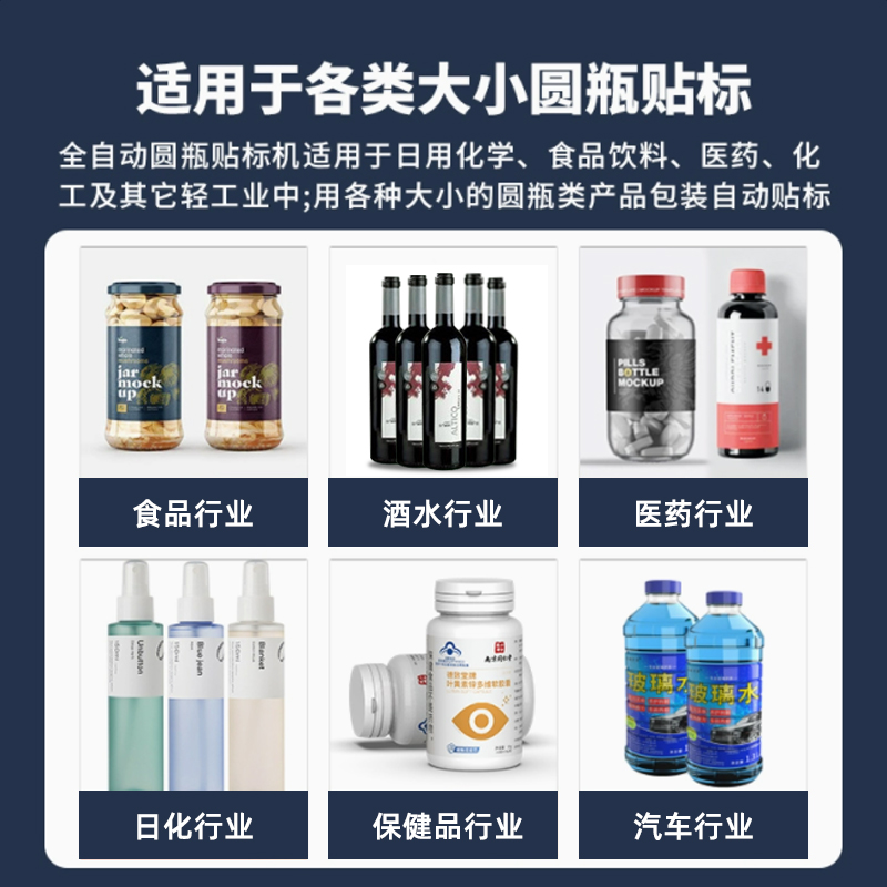 - 适配范围广,换产成本低无需大量更换机械部件,即可兼容直径 30-100mm(部分可定制)的圆瓶,支持玻璃、塑料、金属等不同材质瓶身;同时能处理不干胶、监管码、防伪标等多种标签,换产时仅需在触摸屏调整参数,10 分钟内即可完成切换。