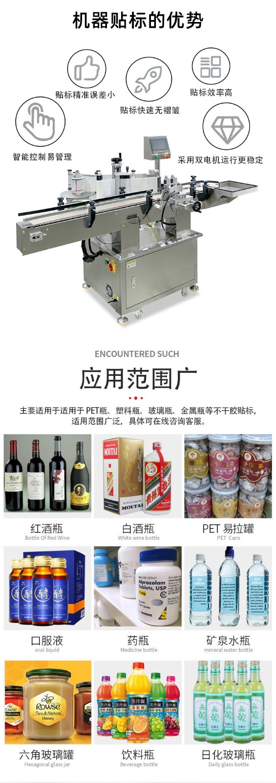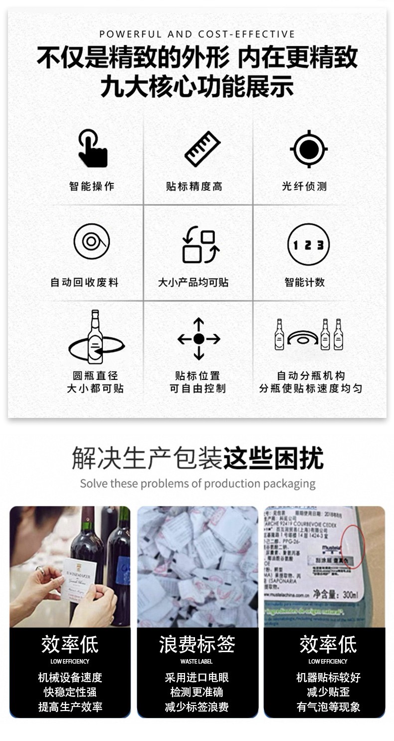 圆瓶定位贴标机的核心优势是精准度高、适配性强、自动化程度高,其效率则体现在稳定的贴标速度和低故障率上,能显著降低人工成本并提升包装一致性。