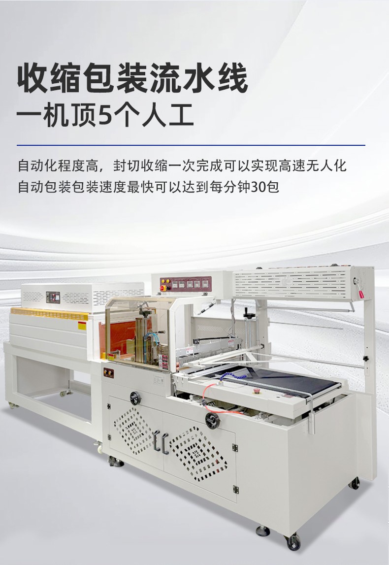 - 工作原理6:通常基于恒温加热技术,先将收缩膜加热至所需温度,然后对已包裹产品的收缩膜进行热封切操作,再将完成封切的产品送入收缩炉内加热,使收缩膜收缩并紧密贴合产品,最后经冷却得到平整美观的包装效果。