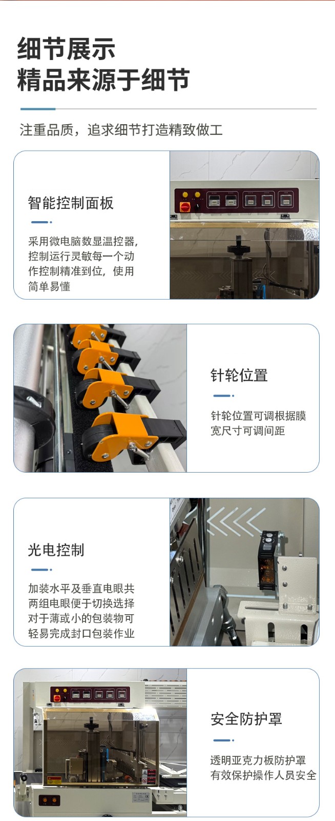 - 结构组成:一般由封切装置、热收缩炉、输送系统、送膜机构和控制系统等组成。封切装置用于对膜进行封口和切断;热收缩炉提供热量使膜收缩;输送系统负责传送产品和包装好的物品;送膜机构实现膜的输送和定位;控制系统则用于设定和控制各部分的运行参数。